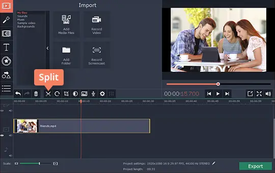 As you can see it is really very easy to cut videos into parts with Movavi Video Editor, and when you’re satisfied you can click ‘Export’ to save your video. Before you do that however, you may want to process the footage in other ways to improve its quality or fix common issues. Additionally you could polish it by applying special effects or filters, adding captions, including audio tracks, inserting animated transitions, and so on.