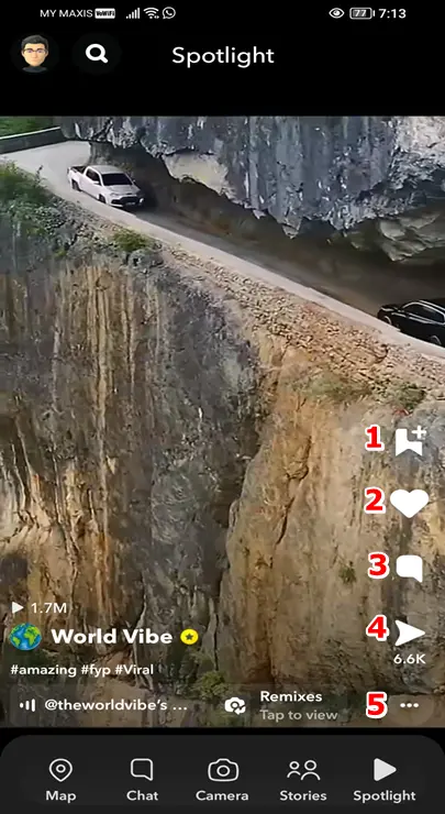 5. 3-Horizontal dots: Allows you to report, remix, or share the current snap with someone.